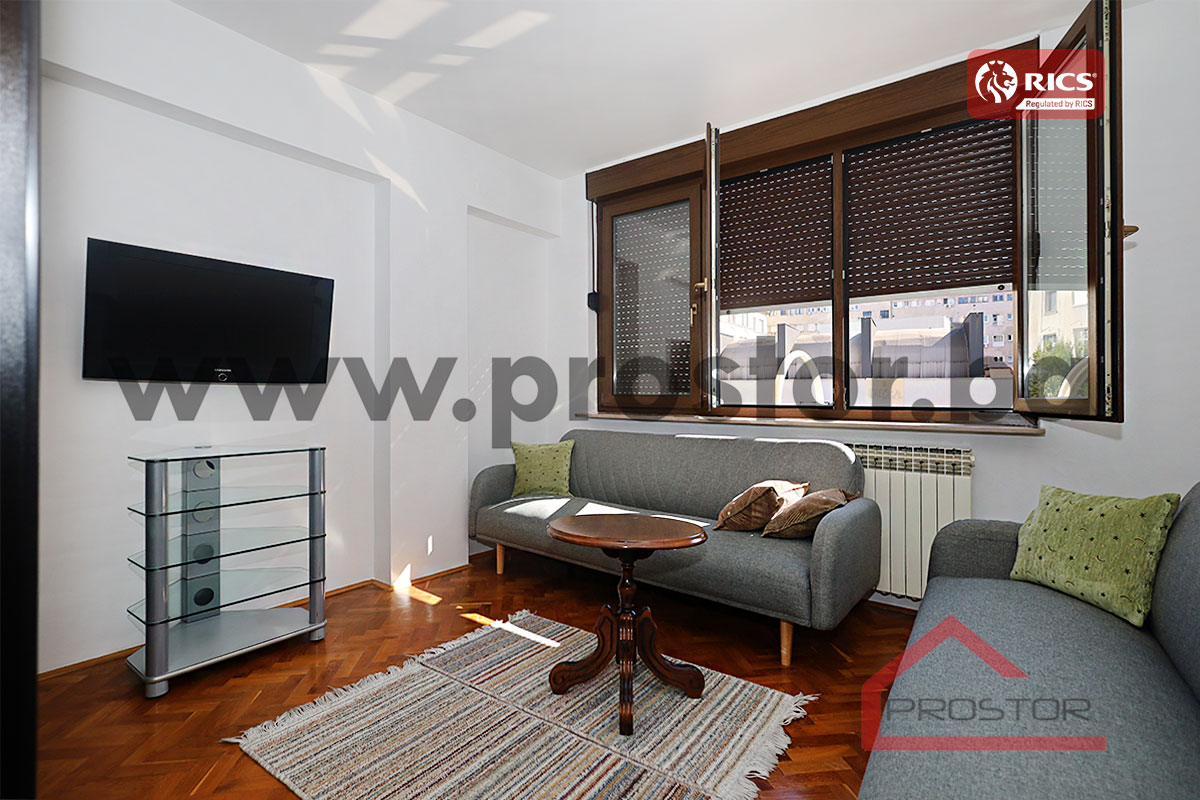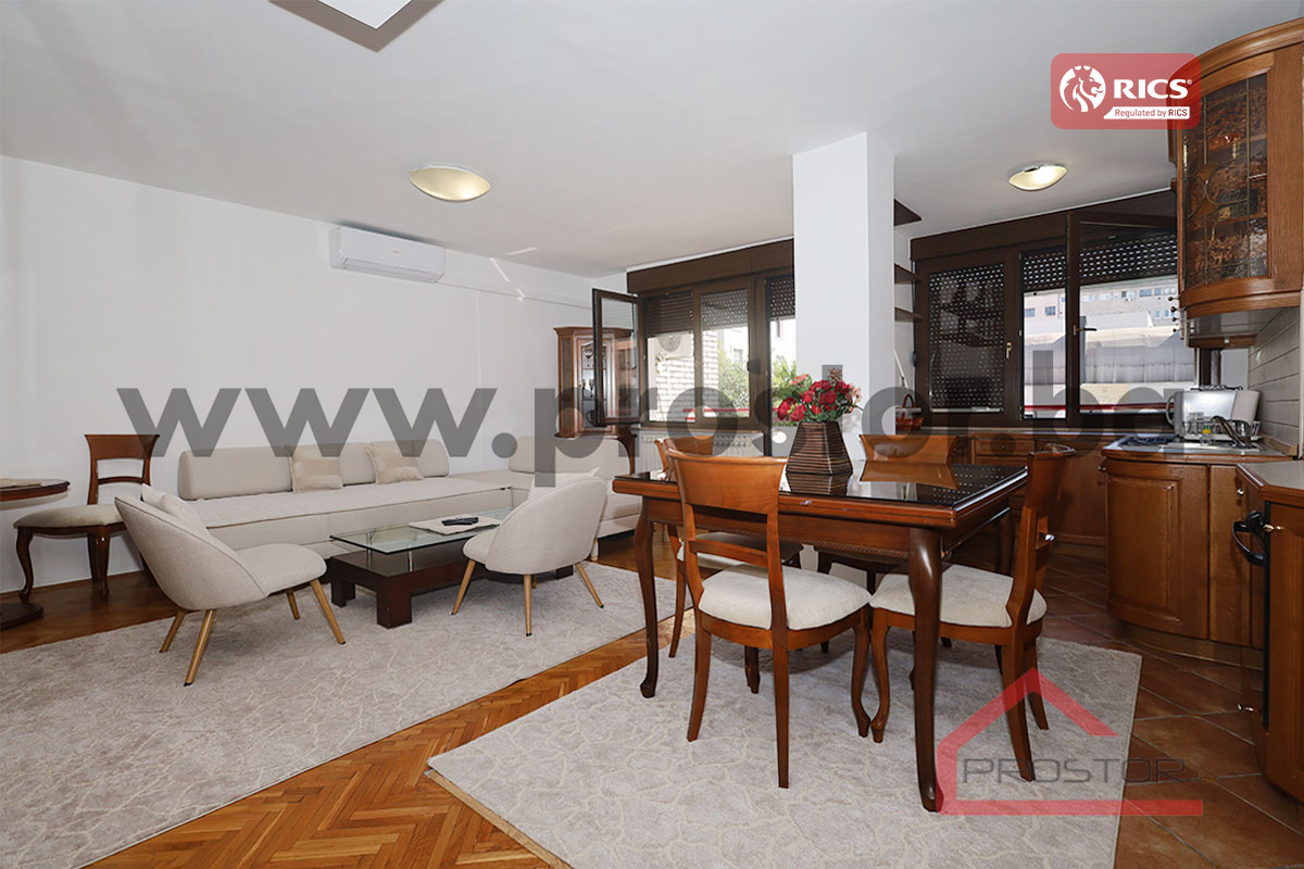 A spacious and bright apartment of 87 m⊃2; is available for rent, located on the first floor of a residential building in Branilaca Sarajeva Street 19B, right in the heart of the city – directly across from the National Theatre. The location is one of the most attractive in Sarajevo and represents an ideal place for an urban lifestyle.