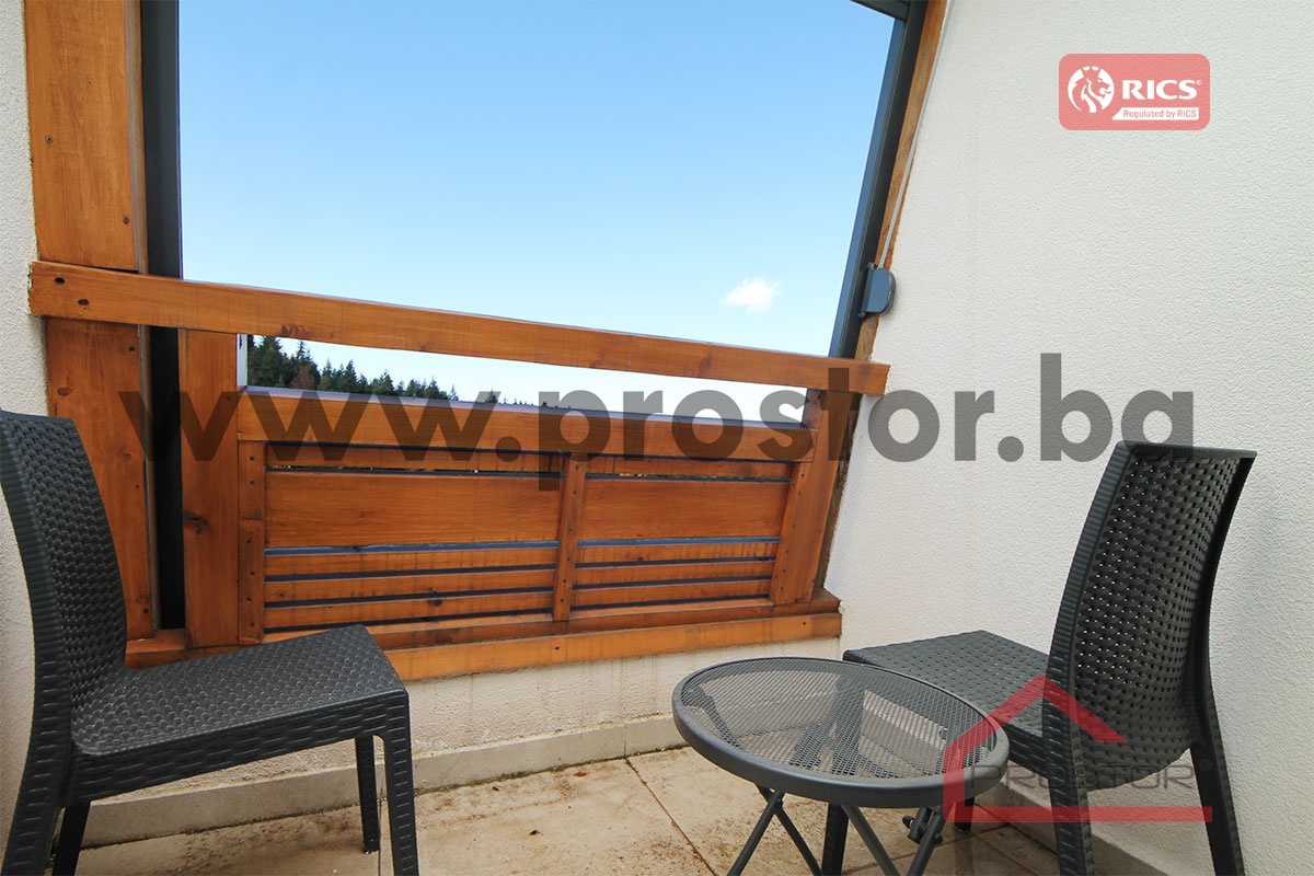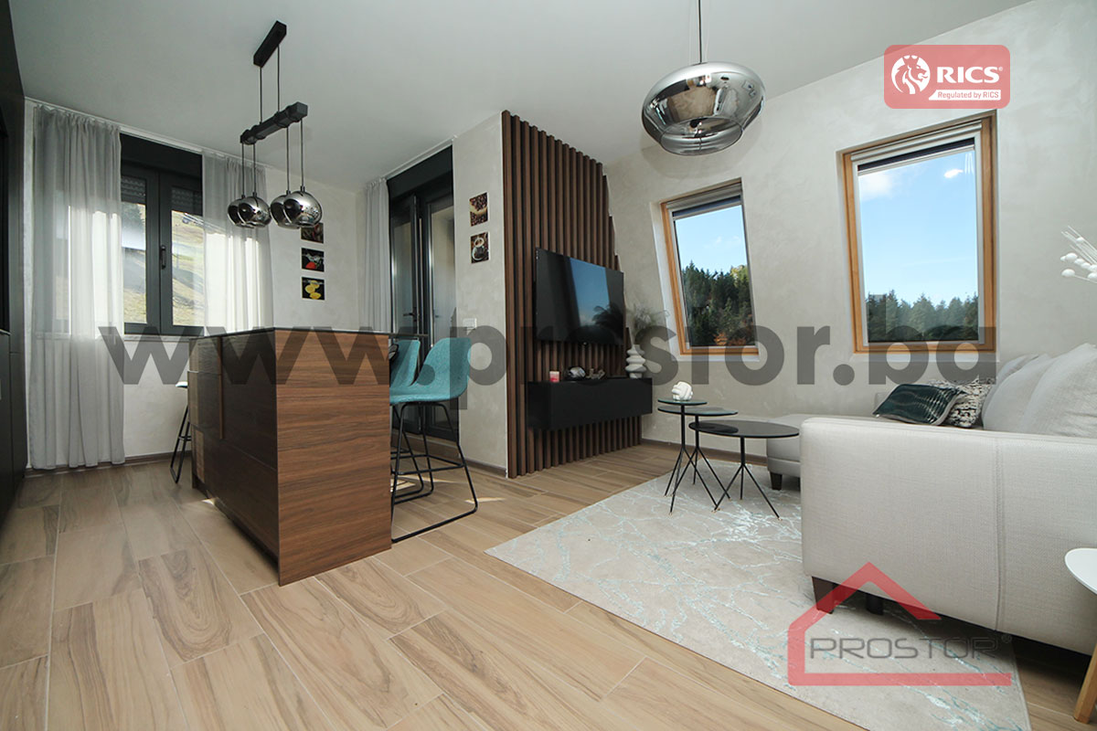 Apartman karakteriše odličan raspored prostorija, maksimalna iskorištenost prostora i izvrsna mikrolokacija, svega nekoliko koraka od ski-staze i glavne gondole. Stan se sastoji od prostranog dnevnog boravka i kuhinje izvedenih u savremenom open space konceptu, jedne komforne spavaće sobe, elegantnog hodnika, modernog kupatila i balkona. Apartman je potpuno namješten i spreman za useljenje, sa pažljivo biranim komadima namještaja koji se savršeno uklapaju u planinski ambijent.