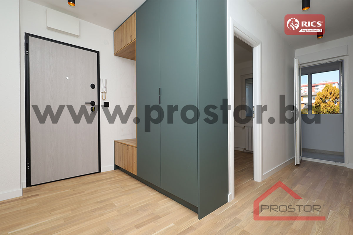 Ravno od ulaznih vrata je predsoblje iz kojeg se na desno pristupa dnevnom boravku i degažmanu, lijevo manjoj spavaćoj sobi, kuhinji i lođi, ravno kupatilu i toaletu. Iz degažmana se pristuopa preostalim dvjema spavaćim sobama. Izlaz na balkon je iz dnevnog boravka. Ulaz u ostavu je iz lođe.