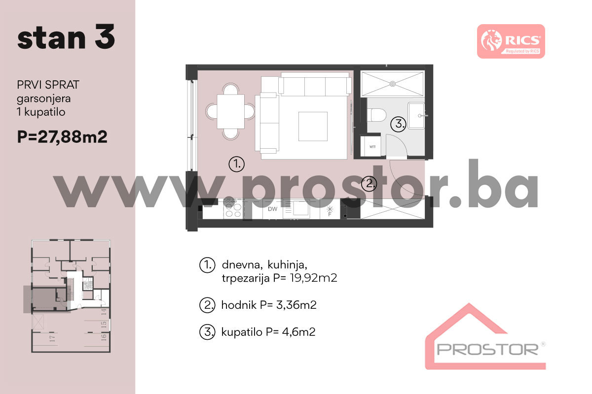 Sa velikim zadovoljstvom Vam predstavljamo novu, savremeno dizajniranu garsonjeru površine 27,88 m⊃2;, smještenu na prvom spratu manje, moderno projektovane stambene zgrade sa ukupno pet spratova, koja se gradi na jednoj od najtraženijih lokacija u Sarajevu – Skenderiji! Garsonjera je osmišljena tako da maksimalno iskoristi prostor, nudeći udobnost, toplinu i praktičnost u svakom svom detalju.