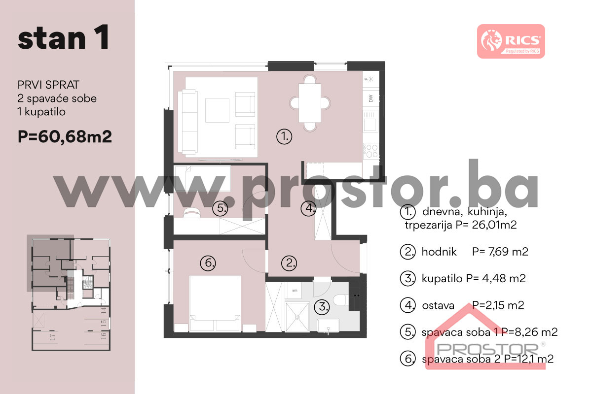 Predmetna nekretnina se nalazi na prvom spratu površine od 60,68m2, s cijenom od 447.820,00 KM u uključenim PDV-om!