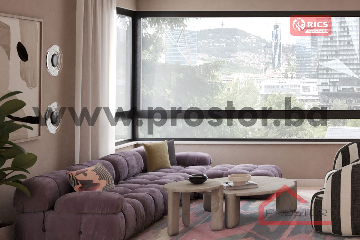 Stan je dvostrano orijentisan, što mu omogućava obilje prirodnog svjetla tokom cijelog dana, dok direktan pogled na centralni dio grada stvara osjećaj povezanosti s urbanim životom.