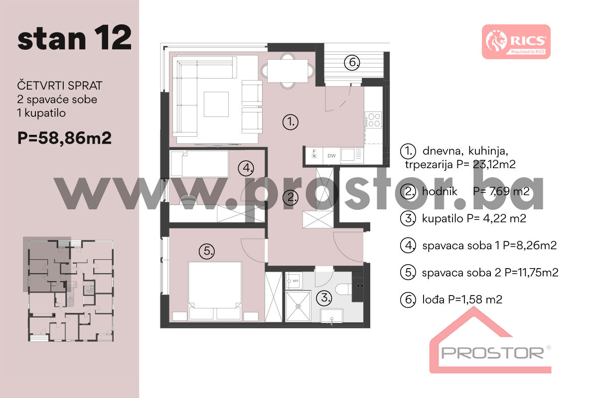 Predmetna nekretnina se nalazi na četvrtom spratu površine od 58,86m2, s cijenom od 503.253,00 KM u uključenim PDV-om!