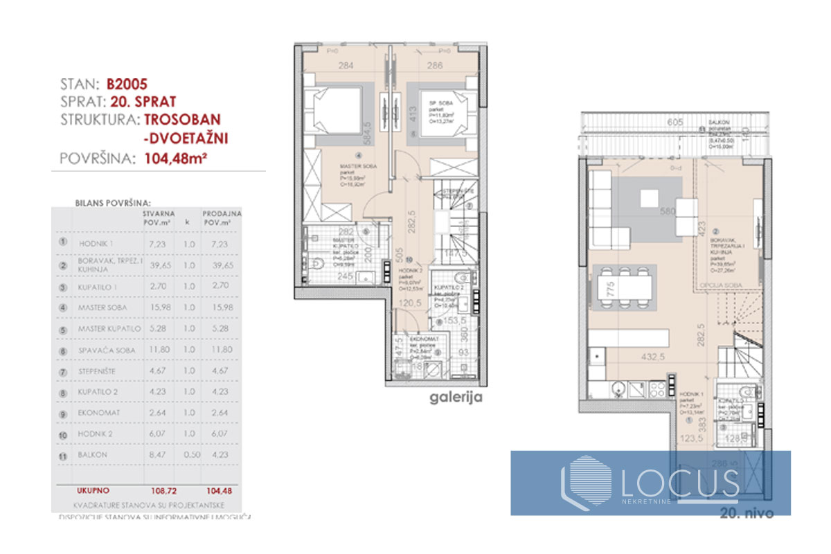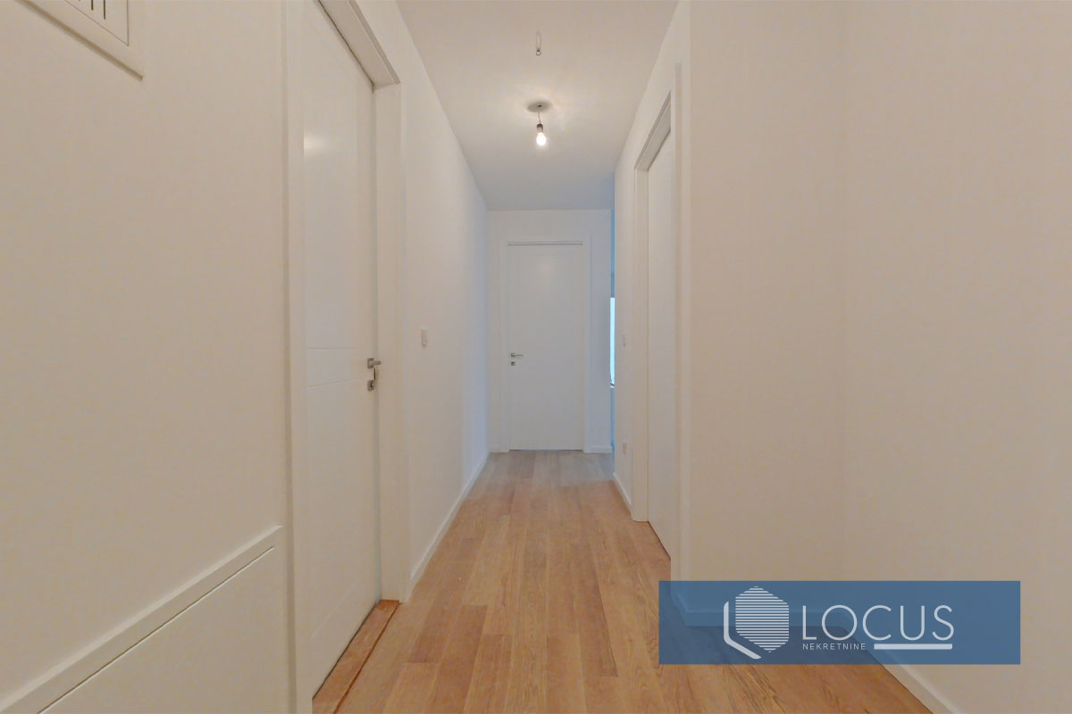 Dnevni boravak sa kuhinjom i trpezarijom u „open space“ izvedbi površine cca. 40m2, master soba i kupatilo, spavaća soba, dva kupatila, ekonomat, stepenište, hodnik i balkon. Stan površine cca. 115m2 sadrži i hobby sobu.